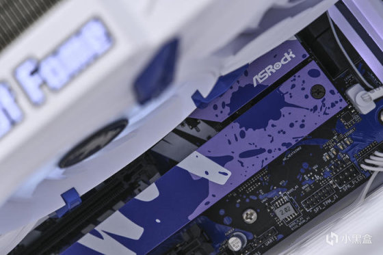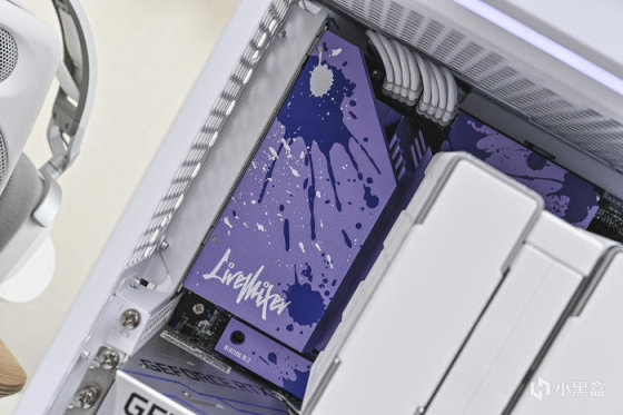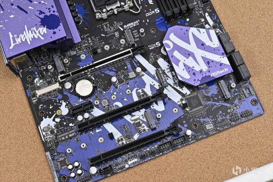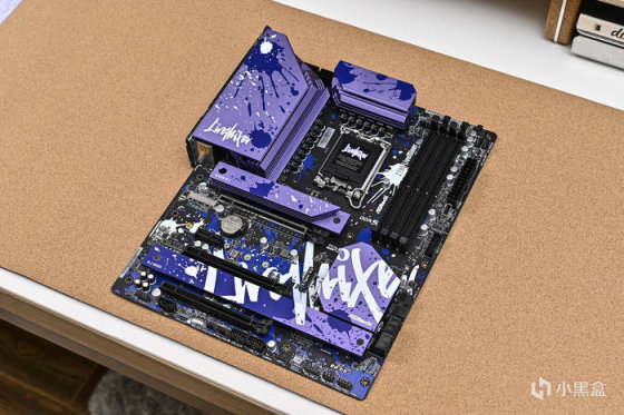 取出主板。可以看到華擎 Z790 LiveMixer 這款 ATX 主板配色非常個性,黑色的PCB,紫色的散熱裝甲,在此基礎上用藍色做了噴墨噴塗,使用白色進行藝術字體塗鴉。