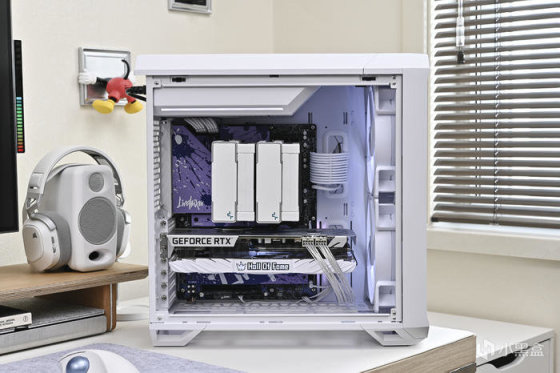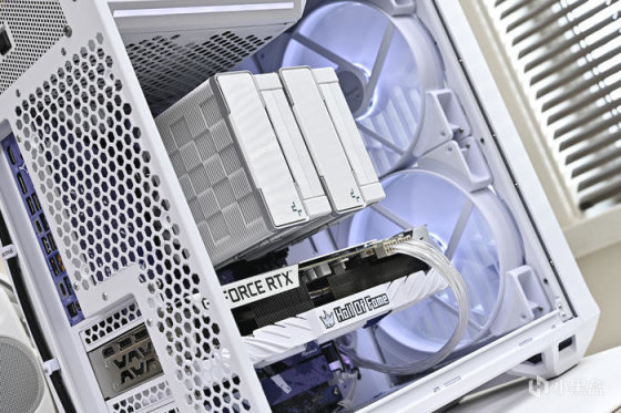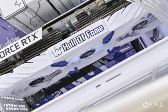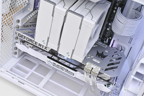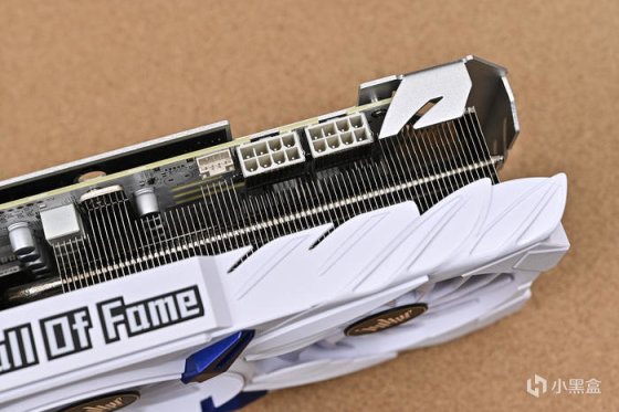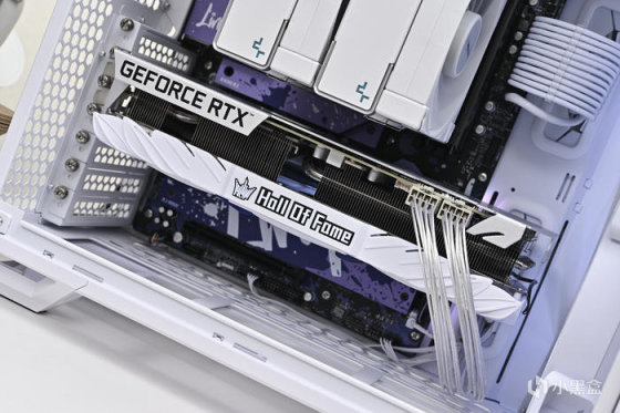 導風罩中央的 Hall of fame Logo RGB 燈效。由於是上置電源設計,顯卡模組線比常規要長一些,還好影馳附贈了一對鍍銀延長線,在淺色方案裝機中也比較合適。
