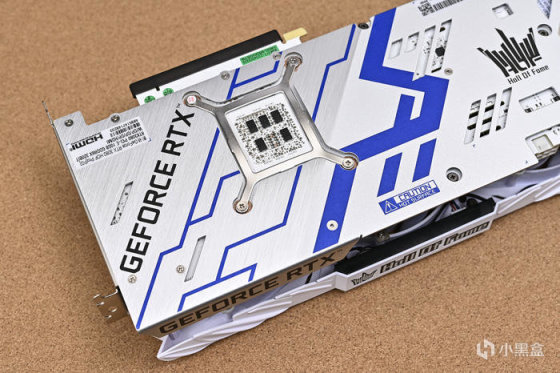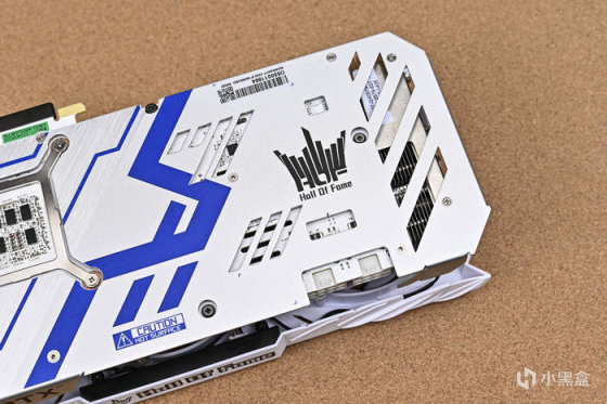 影馳 RTX 3080 HOF Pro 背板爲一體成型鋁合金背板,提高 PCB 強度避免彎折,表面採用金屬拉絲加藍色機甲線條紋路設計,並加入了多出鏤空設計,不僅能夠加速空氣流動,增強熱量排出。內部的 PCB 也是純白色PCB,PCB 面板是採用 12 層鏤空設計,不但能夠減小電氣損壞和發熱量,而且還能提升顯卡的穩定性。