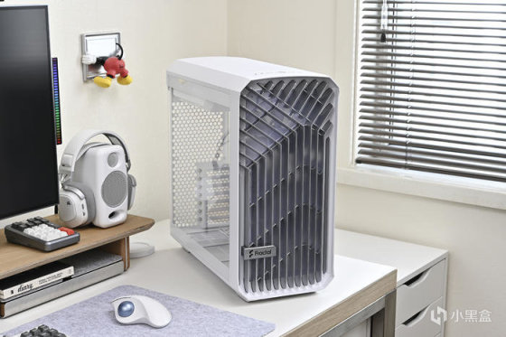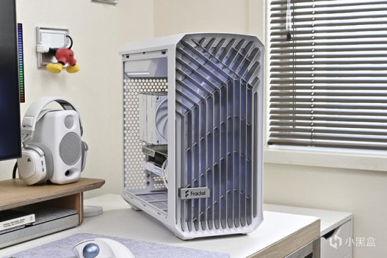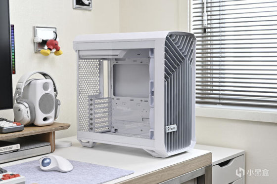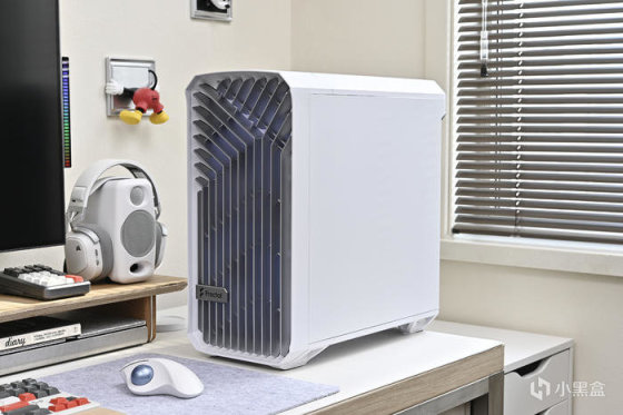 機箱來自分形工藝 Fractal Torrent Compact RGB 極光白。這款白色機箱是此前 Tottent Compact 標準白色版的升級版本,尺寸爲 450x222x467mm,整機尺寸各方面沒有變化,在細節和燈效方面做了提升,整機所有板材、線材、風扇甚至是主板塑膠擋線板都做了白化處理,前置雙 18cm 風扇升級爲 AL-18 PWM RGB,支持主板燈效同步。“torrent”是急流、湍流的意思,分形工藝這個系列在外觀和功能方面都融入這個概念,正面作了流動的線條設計,留出寬闊的開放式進氣格柵。以下爲機箱各角度展示。