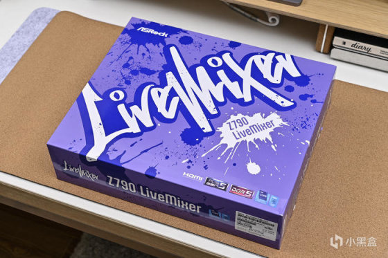 主板來自華擎 ASRock Z790 LiveMixer。這款主板是華擎專爲內容創作者設計的,性能穩定可靠並提供完善的擴展連接組合,而且爲流媒體和直播的輔助設備提供良好支持,最多提供 23 個 USB 端口,讓用戶可以連接各種外圍設備;主板上有兩個 PCIe x4 插槽(x16 外形)和雷電接針,可以同時插入顯卡、視頻採集卡和雷電擴展卡;支持 PCIe 5.0 SSD,同時覆蓋散熱模塊,實現數據的高速持續傳輸;配備 Ultra USB Power,可以將 12V 轉成 5V,通過專用線路設計,除了提供更穩定的電流外,獨立的迴路更可避免其他 5V 設備的影響,減少 USB 音頻設備遭受的噪聲;提供了閃電遊戲端口,通過專用控制器連接,專門用於提供最低延遲的鼠標和鍵盤輸入,減少抖動和延遲。。外包裝紫色打底並做了藍色噴墨塗鴉,中央斜向 LiveMixer 藝術字樣。