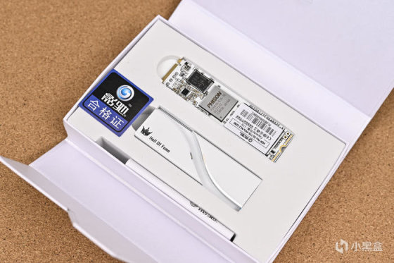 打開磁吸蓋板,內部白色發泡海綿包裹 SSD、散熱器,保護運輸安全,還有一本使用指南及合格證。