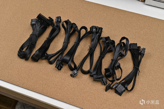 配套的模組線都採用扁平線設計,便於走線,均爲黑色,如果是白色會更好。模組線纜共有:1 條 24pin 主板供電線,2 條雙 4+4pin 的 CPU 供電線,2 條雙 6+2pin 的 PCI-E 供電線,2 條五口的 SATA 接口供電線,以及 1 條四口大 4PIN 接口附帶 1 個 FDD 接口供電線。
