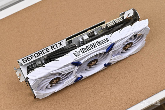 影馳 RTX 3080 HOF Pro 正面導風罩採用純白色配色搭配藍色裝飾塊點綴,散熱模組使用全新的大天使散熱系統,中央 90mm 靜霜風扇燈效。
