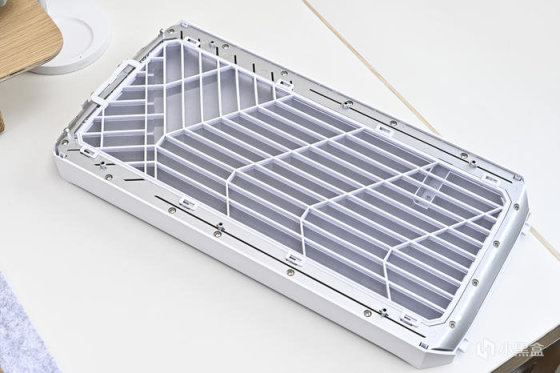 頂蓋抽拉式開啓設計,尾部可安裝手擰螺絲固定,打開頂蓋,可以看到頂部預裝 1 個 2.5\3.5 寸硬盤支架,手擰螺絲快拆式設計,不使用可拆出。硬盤支架右上角旁邊還有一個水冷注水口,方便分體水冷用戶使用。