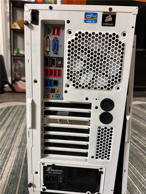 此外,这台电脑还配备了海盗船的ATX机箱和一个520W电源(Seasonic S12 II),其他部件具体型号不太清楚,但可以看到机箱内安装了一张Wi-Fi网卡、一个SATA SSD,机箱贴纸显示当前的CPU是酷睿i3。