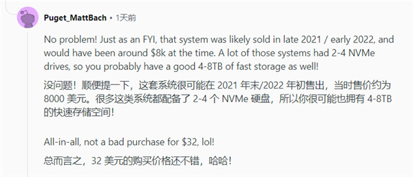 另外,在最近的一次拍卖中,一位Reddit用户分享了他令人羡慕的经历:他以仅23美元(约163元人民币)的价格拍下了一台价值约8000美元(约56984元人民币)的电脑主机。