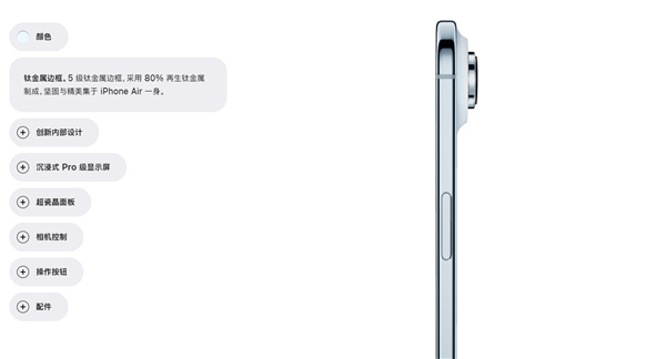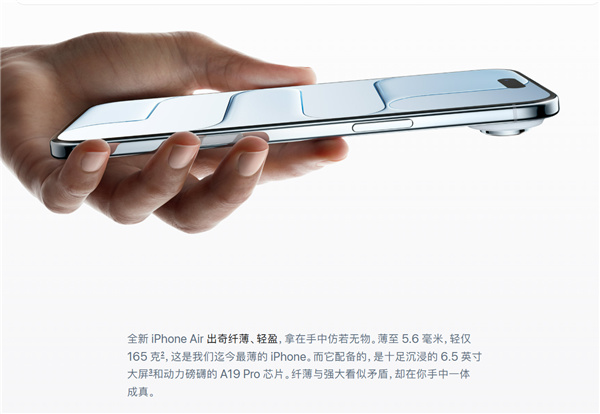值得一提的是,iPhone Air的機身採用了5級鈦金屬邊框。蘋果表示,這款設備符合並超越了其“嚴格的彎曲測試要求”。