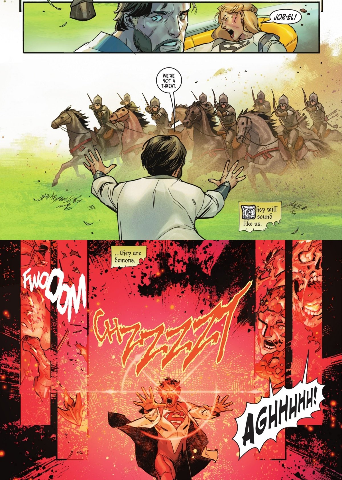 飛船一降落,勞拉就即將臨盆,但這時突然經過一隊騎兵,因爲疑惑與恐懼抽刀上前,生命的危險與妻子的痛苦交織在腦中,就這樣吸收了黃太陽光的喬艾爾雙目一閃,騎兵隊的死亡與卡爾艾爾的降生在同一時刻發生了。