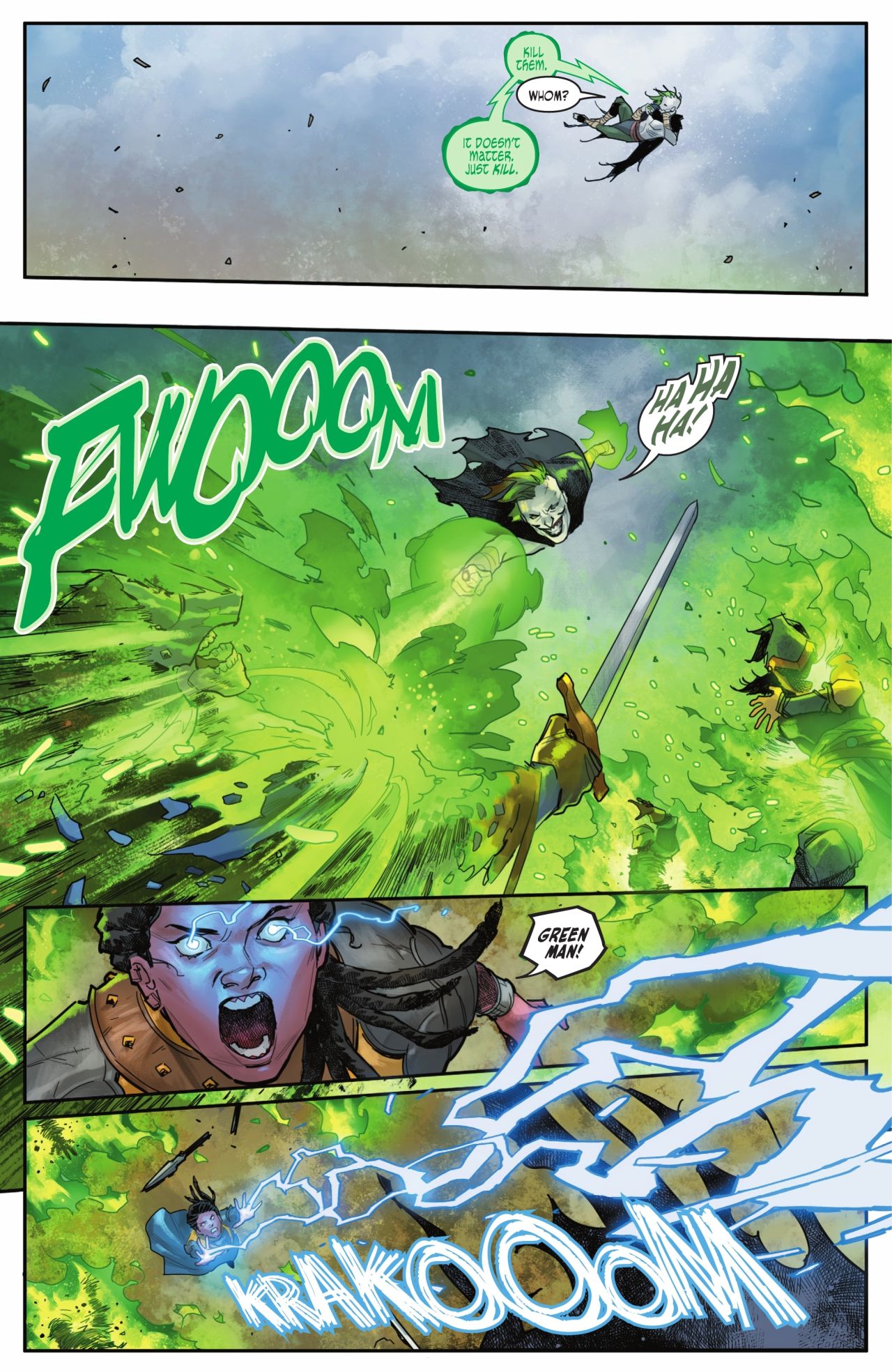 曾經韋恩王室的弄臣盧瑟因爲隱瞞艾爾一家對火山噴發的提醒,選擇溜之大吉,卻在路上觸碰到了某種天外來物,成爲了戴着綠燈戒的小丑“翠綠之人”。
