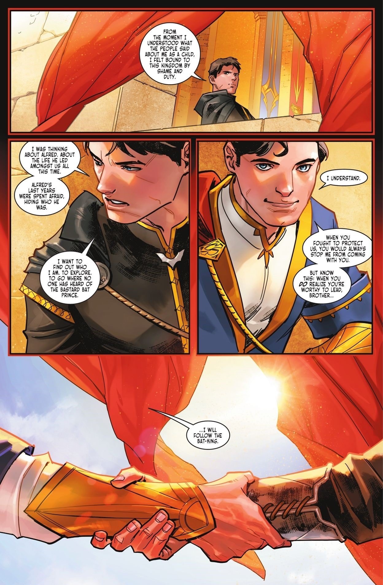 勞拉女王意將王位還給布魯斯,但老爺果斷拒絕,選擇離開這個國度外出遊歷闖蕩,試着打出一片天地,而艾爾家族永遠等着那位“蝙蝠之王”的召喚,就像曾經那樣追隨韋恩家族。