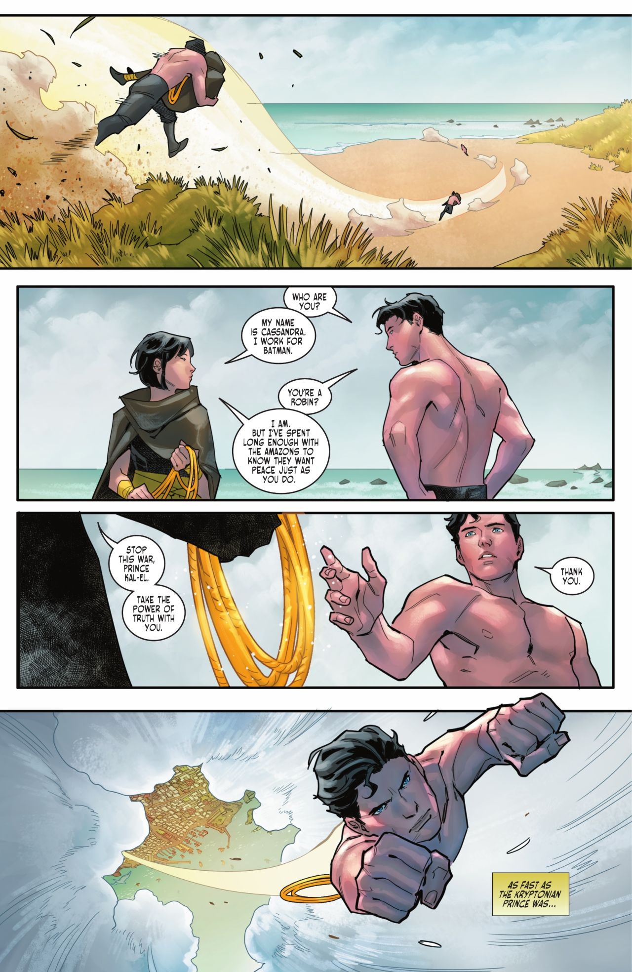 艾爾王子本想獨自去往天堂島說服希波呂特女王止戈,卻被其一劍捅傷,關押在島內的監獄中,也因此遇到了路易斯,不久後布魯斯在天堂島的內線卡桑德拉偷偷潛入放走艾爾王子,並交給了他真言套索去終結戰爭。
