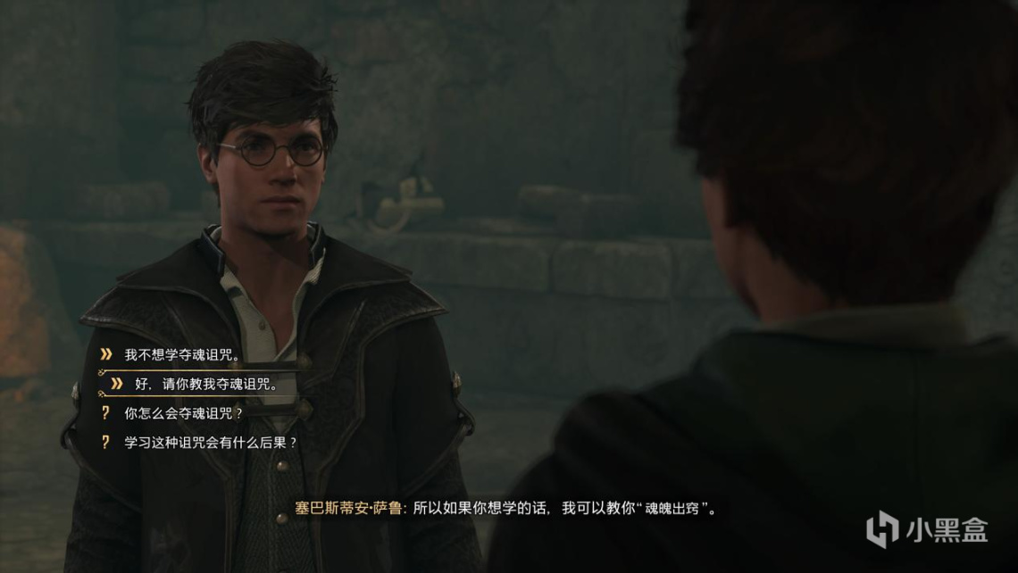 唯一值得肯定的是,在少數幾個與重要同伴展開的支線任務中,遊戲在敘事層面表現出了不錯的深度——尤其是在對角色的情感刻畫上,這些支線劇情所塑造的角色,相比其他支線任務中的站樁聊天NPC,會顯得更加真實且令人動容。這裏以蛇院學生塞巴斯蒂安的系列任務爲例,在他的故事中,玩家不光要面對自己良心上“是否學習不可饒恕咒”的抉擇,而且在推進劇情的過程中,玩家也將看到這位最初目的單純的學生,是如何在黑魔法的誘惑下,不斷突破自己內心的道德底線,走向無法挽回的痛苦深淵。