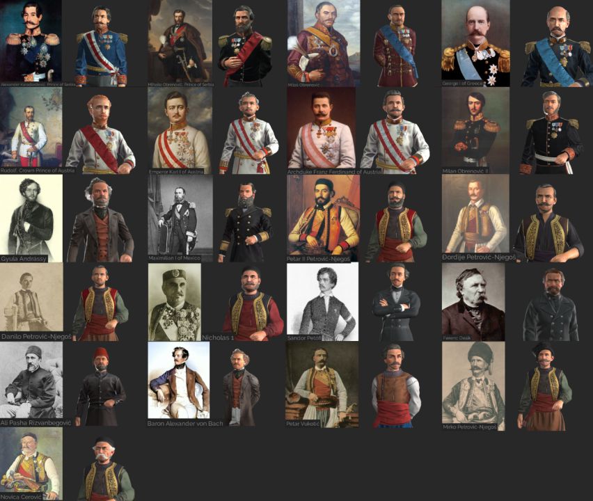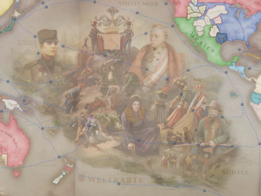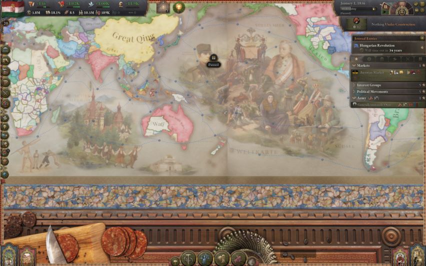 我們在新沉浸包中顯著擴展了曾在Pivot of Empire中實驗過的彩色紙質地圖概念。我們從18到19世紀的東歐圖畫中汲取靈感,製作了一張拼貼畫。這款新設計將一些關鍵事件、人物、衣冠、徽章以及巴爾幹地區特有的日常生活場景混合,並加入了一些奧地利元素。