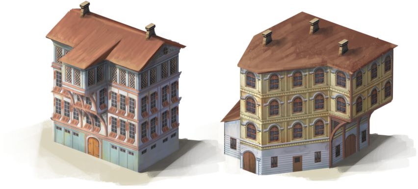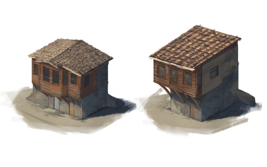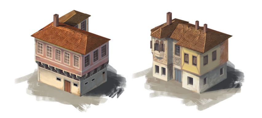 我們決定爲農村貧困階層的建築採用兩種不同的風格,一種靈感源自塞爾維亞茲拉蒂博爾山區的木屋,另一種則來自羅馬尼亞的“邊界”建築。農村中等階層的建築則深受保加利亞北部埃萊娜鎮厚重石牆和房屋地基的影響。最後,富裕階層的建築大量借鑑了拜占庭建築風格,並融入了一些科納克元素。