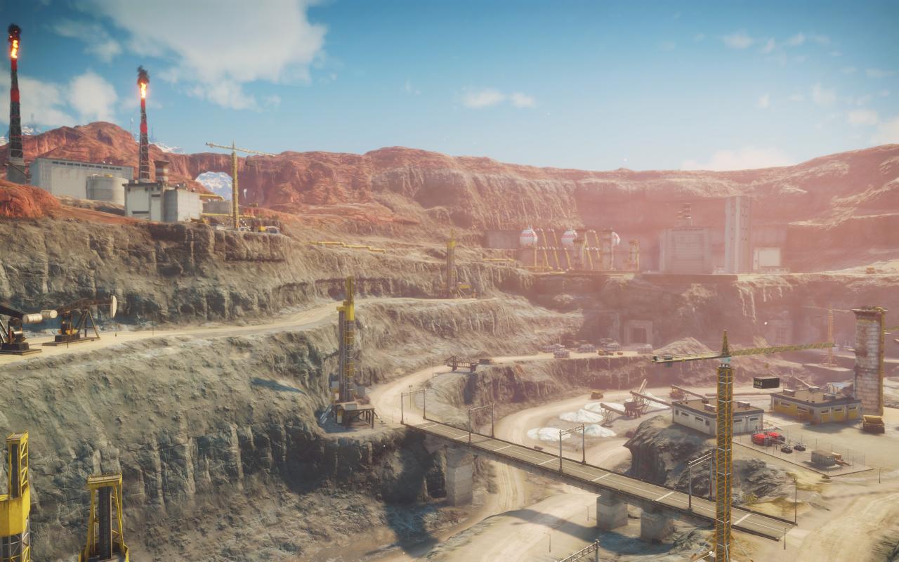 这个炼油厂依矿洞而建,里面有全自动化的生产线和塔吊负责生产,地面上则有工人驾驶的矿车将原料不断输送进工厂内。