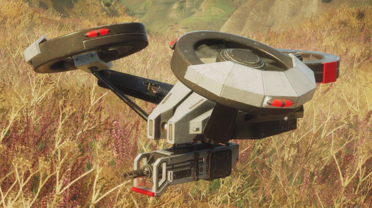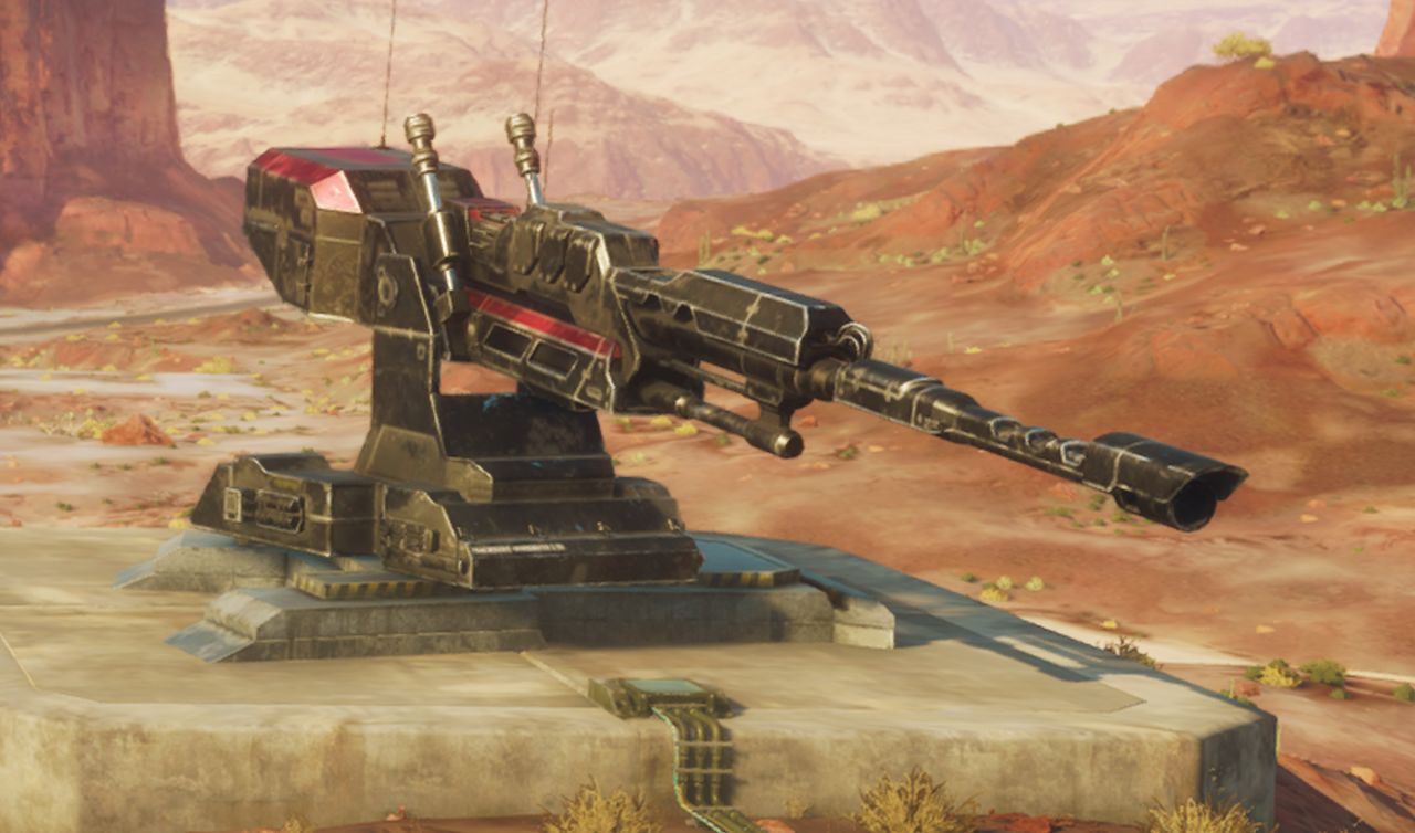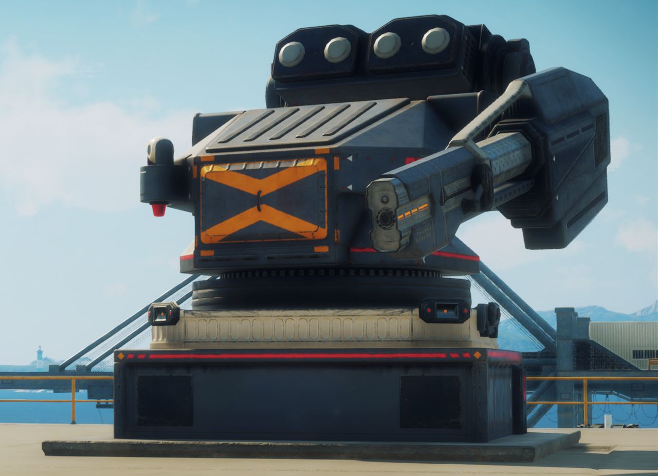 这是一个多功能的攻击炮塔,配有电磁炮,微型跟踪导弹以及一台榴弹发射器,针对空中目标时可以使用跟踪导弹和瞄准能力极佳的电磁炮,当目标在地面时还可以使用榴弹发射器进行驱离。如果靠近炮塔其自身还会释放出强力的电磁脉冲,坚固的外壳使得外界的物理攻击无法撼动这台机器,唯一能威胁他的便是防护板下的机械装置。这种既能对空也能对地的东西被许多基地指挥官宠爱。