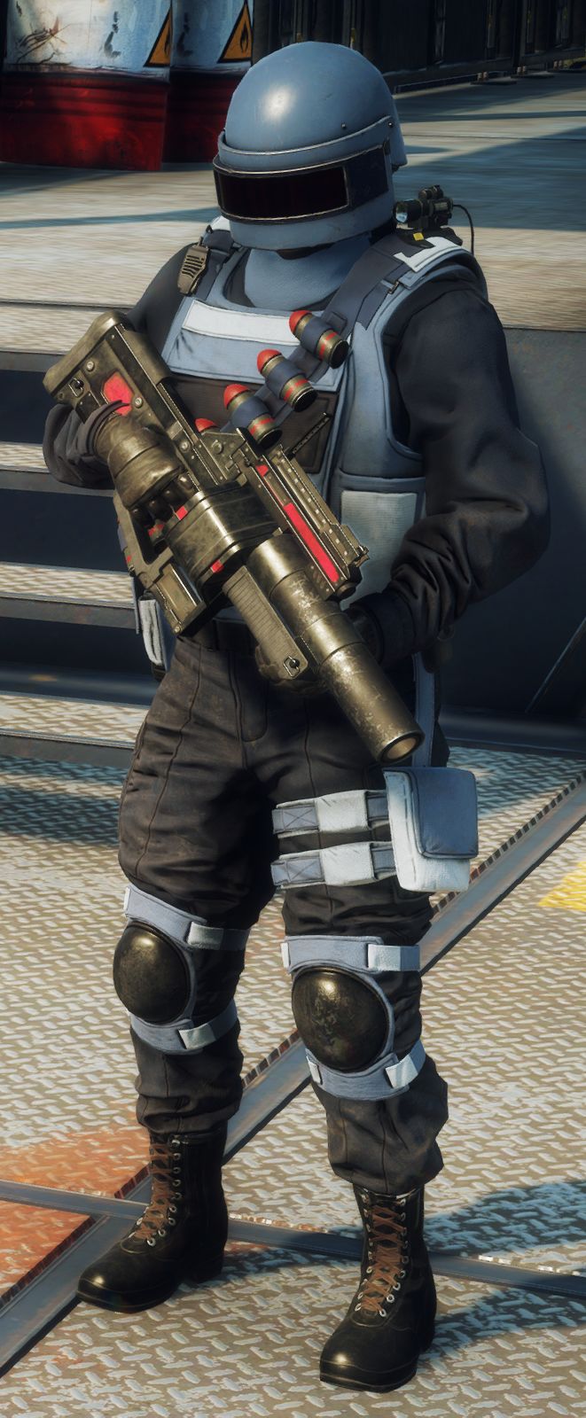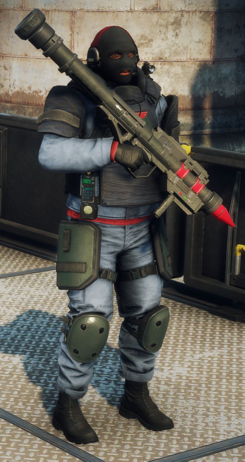 RPG操作手的防护非常全面,除了躯干以外,在四肢上也有护甲覆盖,并且其厚重感明显要比上者明显,操作手同样不佩戴防护头盔,而是选择给自己戴上一顶降噪耳机,在他的腰间配有一部对讲机。RPG操作手使用AT-7火箭筒,在瞄准时会有明显的绿色射线发出。