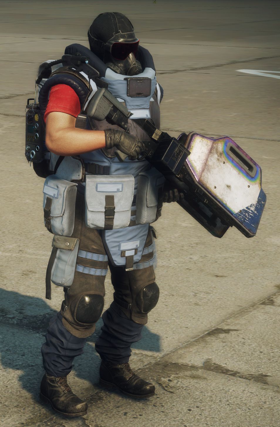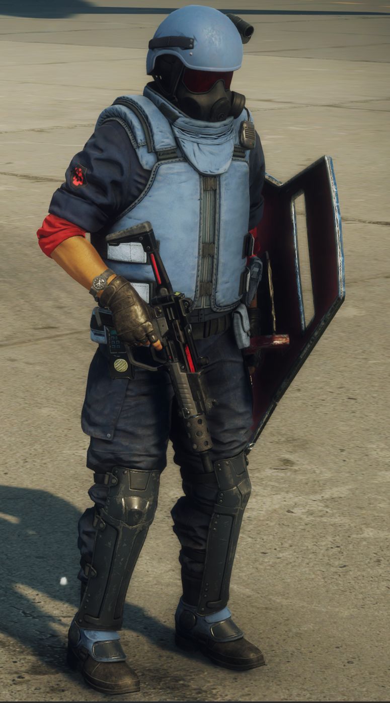 一个雇佣兵集团既然拥有了机枪手和狙击手,那么盾兵自然也就不会缺席,这些人使用SMG-2冲锋枪,会扛着宽大的焊接盾牌将自己的身躯完全挡住,并缓慢向前推进,就是他们唯一的优势,当目标的子弹消耗的差不多了,就是他们开枪的机会。这面盾牌通体白色并且还有弹孔的击痕,但其本身完全防弹,并且在边缘还做了防绕侧处理,只有视窗不设防。盾兵除了装备了防弹头盔和轻型背心以及一个防毒面具外,还在小腿处安装了一双护腿。话虽如此,这些兵种的部署一般都非常分散,无法发挥明显作用,一旦被绕到后面的抓钩咬住,他们就会立刻扔掉自己的盾牌。