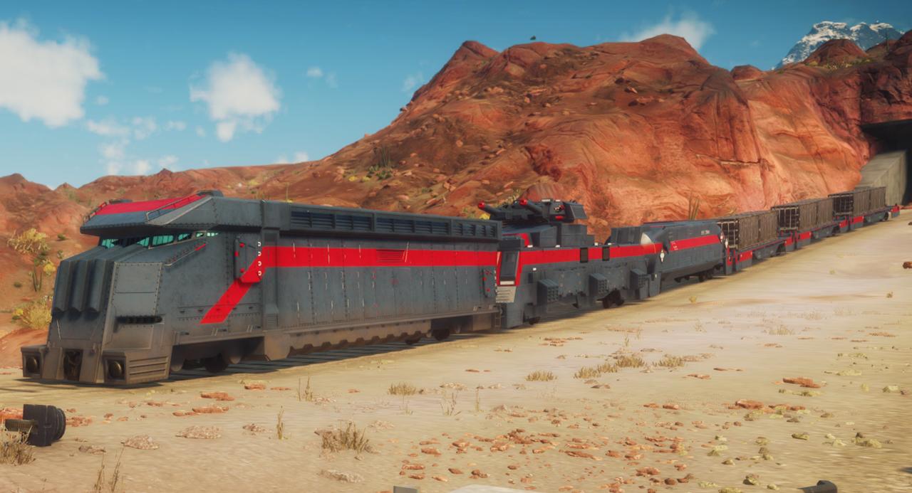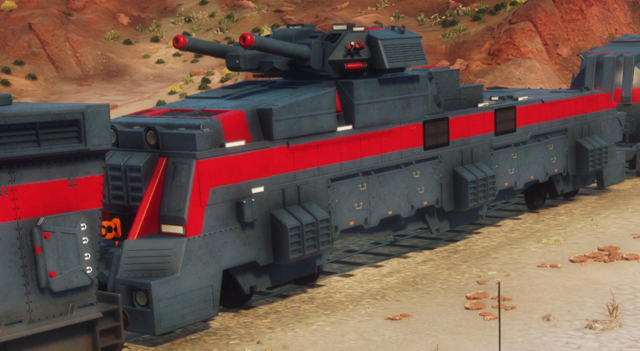 这些大型武装载具目前只应用于第一区和第二区中,毕竟也就这两个区的铁路状况相对良好,装甲火车都配置了非常厚实的防护装甲,火车头已经完全由人工智能接替,实现了无人驾驶。一般来说,一列标准的装甲火车由动力车头、至少一节武装车厢、一节燃料储存车厢,以及位于车尾的用于承载物资的平板拖车。这些物资,有的是平平无奇的集装箱,有的则是军用载具。有些装甲火车会配备两节武装车厢,运送的物资也更多。如果火车发现前方发生了脱轨事故,或是桥梁断裂等无法通行的事故,人工智能会提前踩下刹车(但往往来不及)。