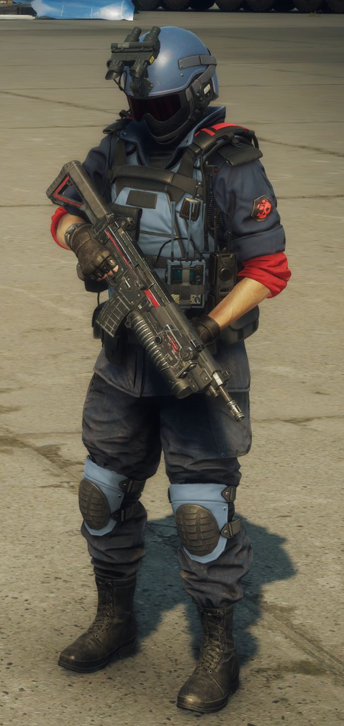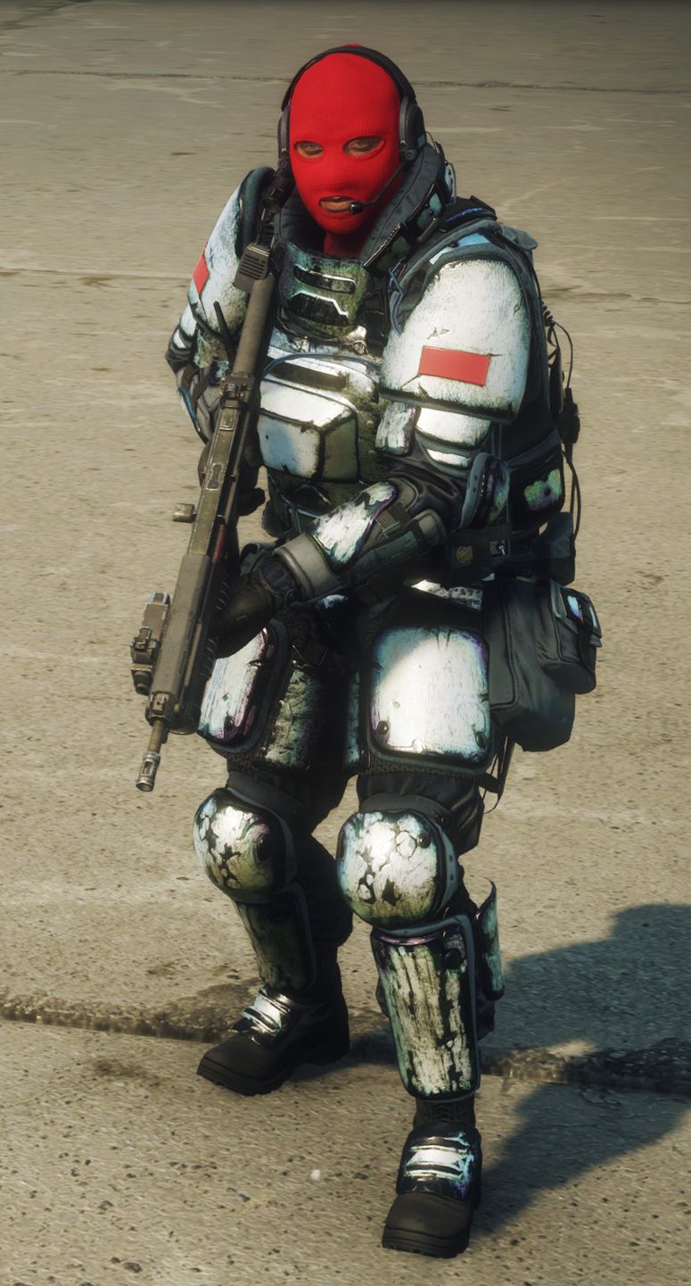 精英士兵的装备明显要好于那些普通的雇佣兵,他们拥有较为全面的防护装备:头上佩戴了防弹头盔和护目镜,在防弹头盔上还安了一个夜视仪,身上披着一件轻型防弹衣,腿上还绑有护膝套件,在身上配有突击手电和对讲沟通设备,背后还有行军背包和装有防毒面具的铁罐。这些人受过更好的军事训练,是黑手军里的正规部队,在武器方面他们的选择就宽裕了许多。SW9突击步枪或CC10霰弹枪都是他们的菜,也有部分经费更充足的人会选择21-J智能步枪。