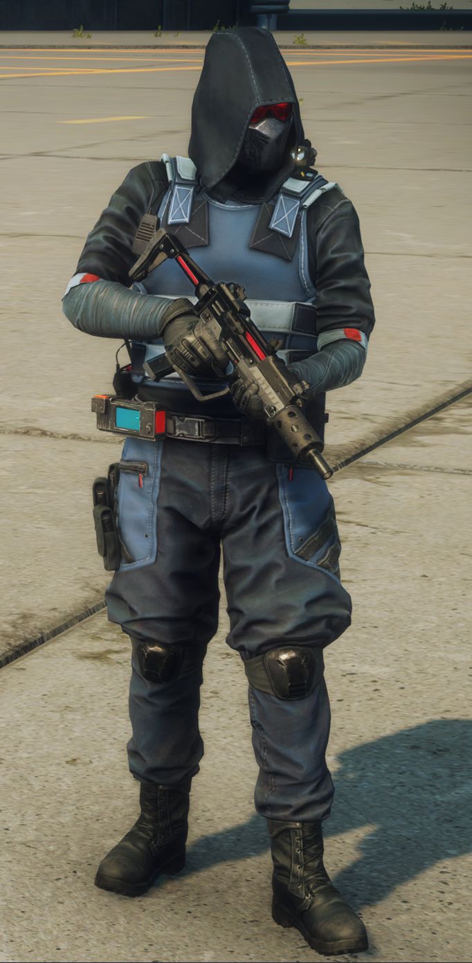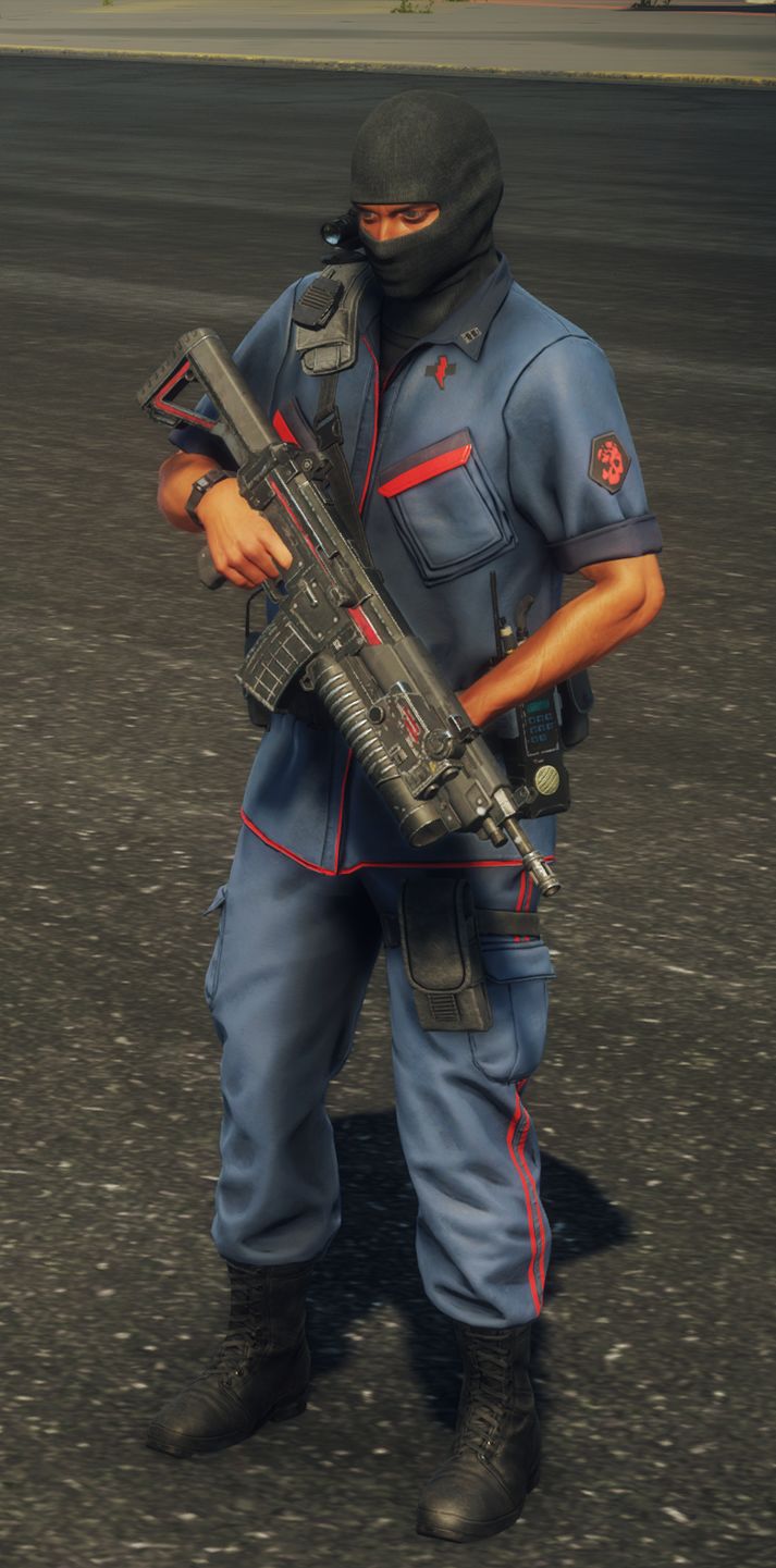 无论在什么阶段下,大部分负责追捕你的都是这些最普通的雇佣兵,黑手军在载具的配色上主要以红色和藏蓝色为主,这种规则也延伸到了服装上。除了标准的制式服装和巴拉克拉瓦头套外,还配备了一台对讲机和突击手电。这些佣兵的武器选择十分丰富,在此阶段他们会使用SW9突击步枪和SMG-2冲锋枪,但在防护装备上则十分有限,他们不佩戴任何防弹背心,而且大部分脏活累活都是他们在干,看守哨卡和军事设施是他们,负责日常治安巡逻的也是他们。如果在不是那么机密的限制区碰到,他们会先用枪瞄准你,并警告你赶快离开,如果依旧不听劝告继续深入的话,他们才会对你开枪。