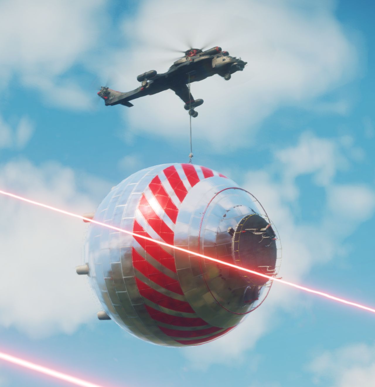 这架起吊直升机时常在空中运输一个巨大的球形燃料罐。