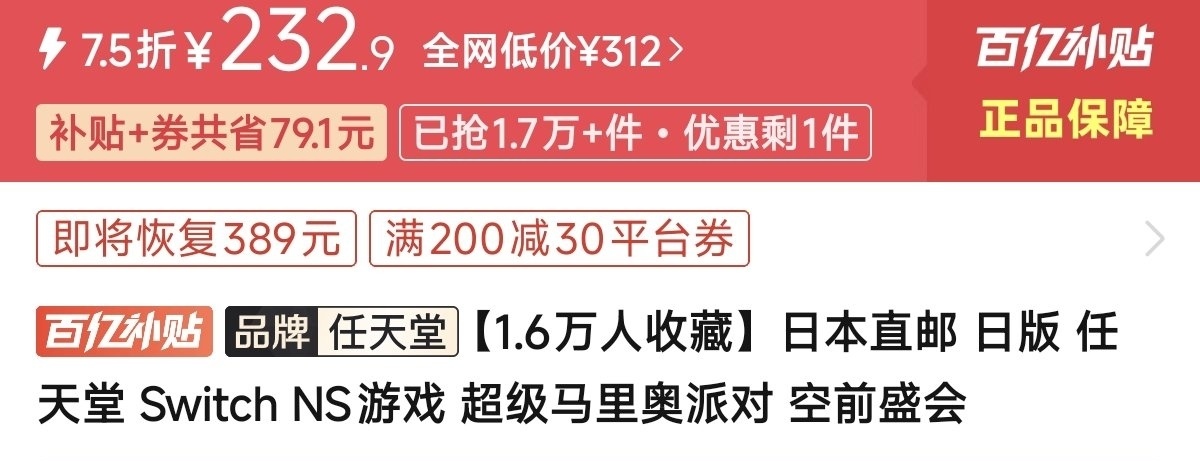 优惠价格:ns1版237元,ns2版291元(以200-30的价格为准)