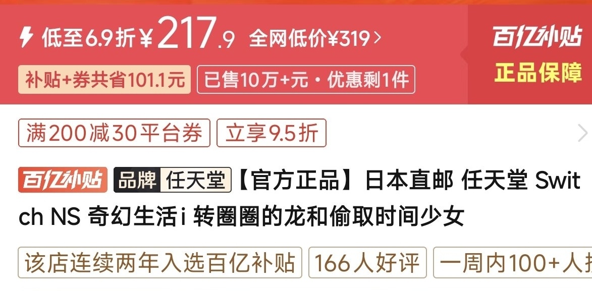 评价:就是一个很萌很治愈的粉丝向游戏,画面惬意、音乐放松,很适合下班后玩一会放空大脑进化心灵。270的价格不算好价,之前最低250左右,并且这款游戏是全平台发售的,pc只要一百多,不是特别推荐购买卡带。