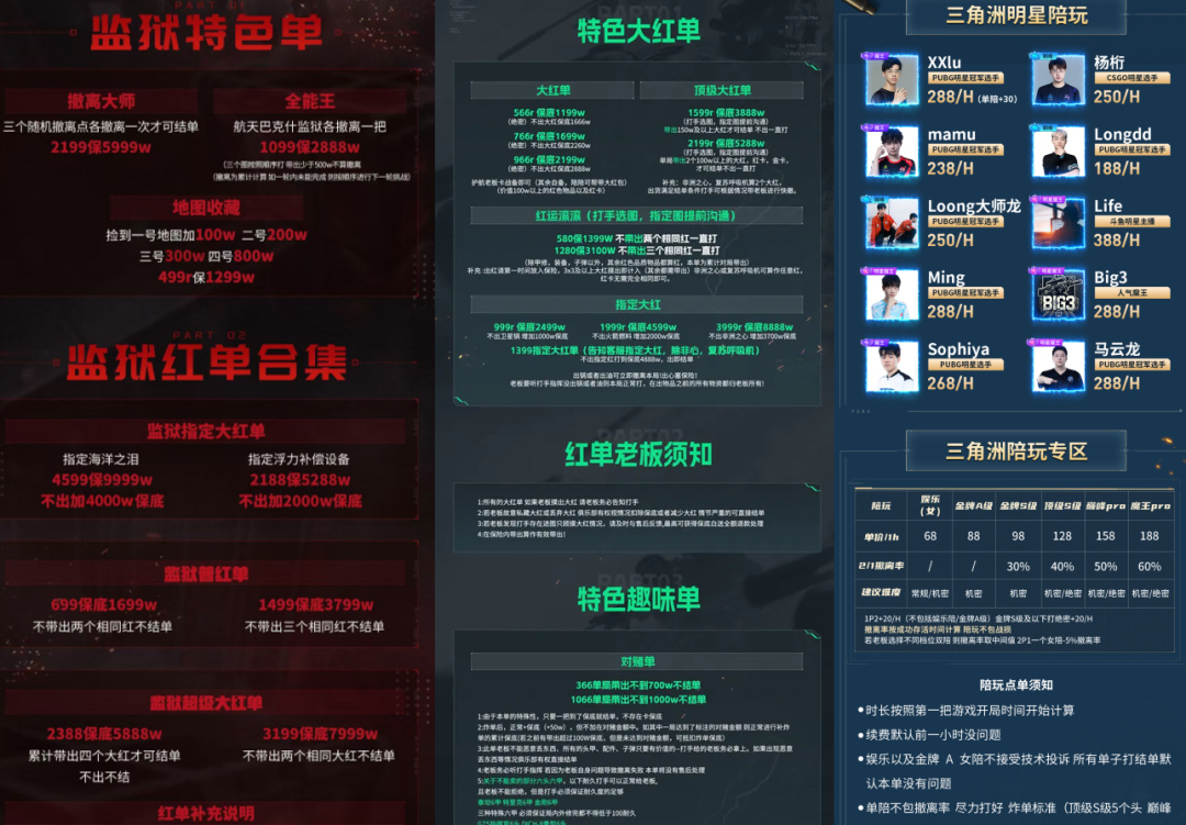 相比常规的护航单,特色单可能更具目的性,且价格较高。例如PeRo特色大红单服务就包括,966r保底2199w(绝密不出大红保底2888w),2199r保底5288w(打手选图,单局带出2个100w以上的大红,红卡,金卡,才可结单,不出一直打)。又或是鉴于红单的指定海洋之类(4599r保9999w,不出加4000w保底)等更高售价的特色服务等。