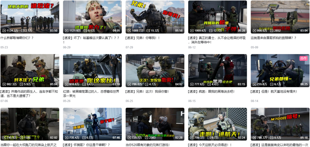 在抖音、快手、B站等平台上,速凌电竞通过制作三角洲动画,吸引了不少粉丝关注。尤其是在B站上,其自主创作三角洲动画视频基本都在百万播放量级,“兄弟!你等我!”、“坏了!哈基蜂这次要认真了!??”、“什么桥都敢堵啊你们??”等速凌系列视频播放量更是超过千万。此外,其动画视频标签中也包括一些“合作”项目。