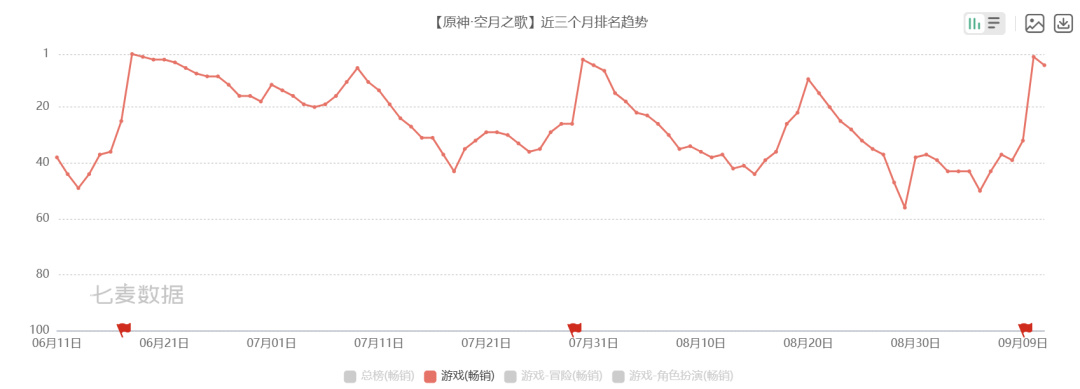 調整故事重心帶來的效果十分顯著,自5.6版本後,《原神》連續三個版本更新當天都進入了暢銷榜Top3,還在5.7版本登頂暢銷榜,達成了時隔一年再度登頂的成就。