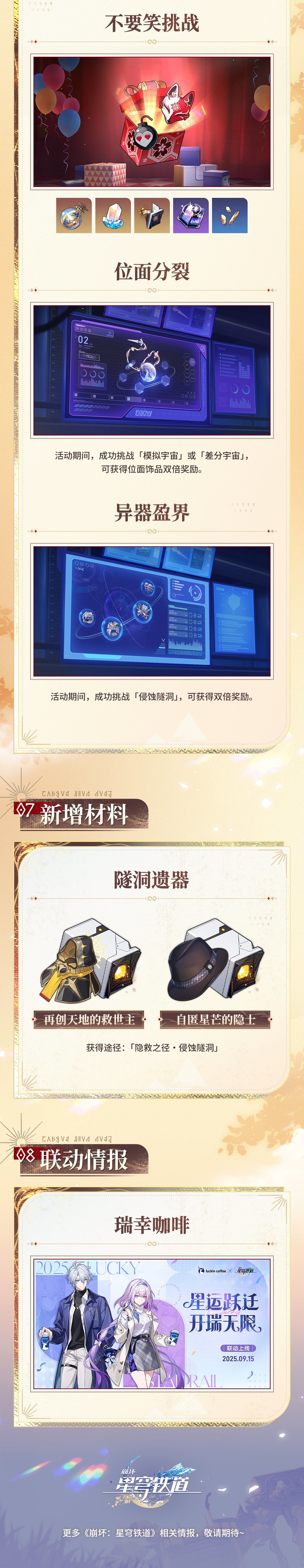 3.活动:巡星之礼;天气真好,养它;缤纷大乱斗;不要笑挑战;列车长的特别关照(干涉密钥x1);异相仲裁(每版本更新一次)