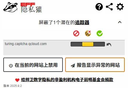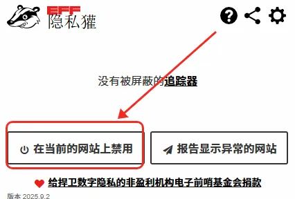 在你成功安装到你的浏览器里之后,建议你把隐私獾固定到你的工具栏里,这样后续就会很方便你查看在当前这个网站上都禁用了啥。