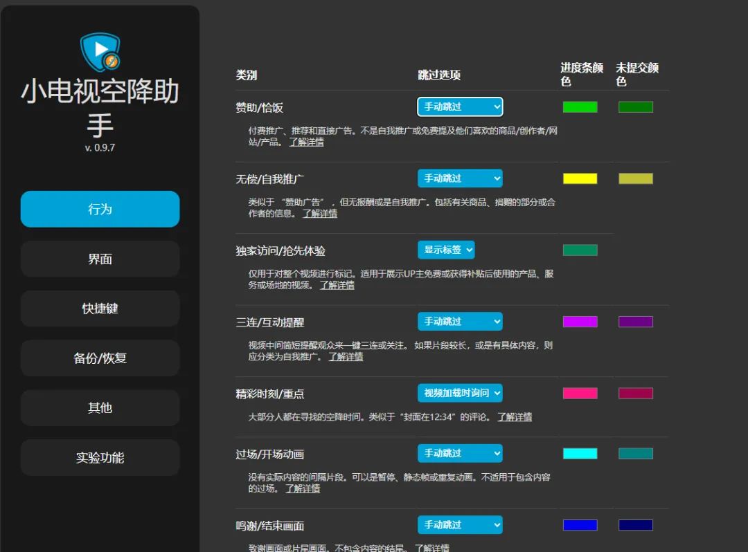 更方便的是,它还能分类型标记,比如赞助广告、up自我推广、开场动画、三连互动等等。