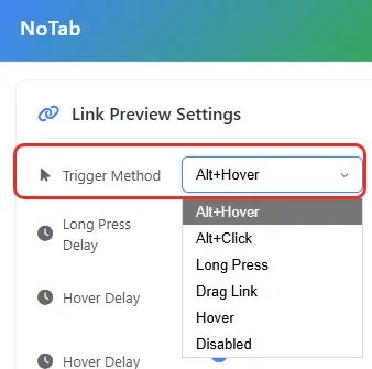 如果你觉得 Alt+悬停不够顺手,还能在设置里换成长按、双击等其他方式。