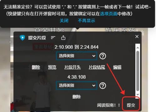 确认无误之后,通过快捷键【‘】来调出提交界面,点击提交即可完成上传。等其他人看到这个视频的时候,插件就能自动跳过你标记的那段内容了。
