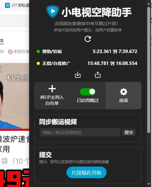 这个插件原本是从YouTube上的SponsorBlock项目改过来的,可以在B站实现自动跳过视频里的“恰饭片段”。