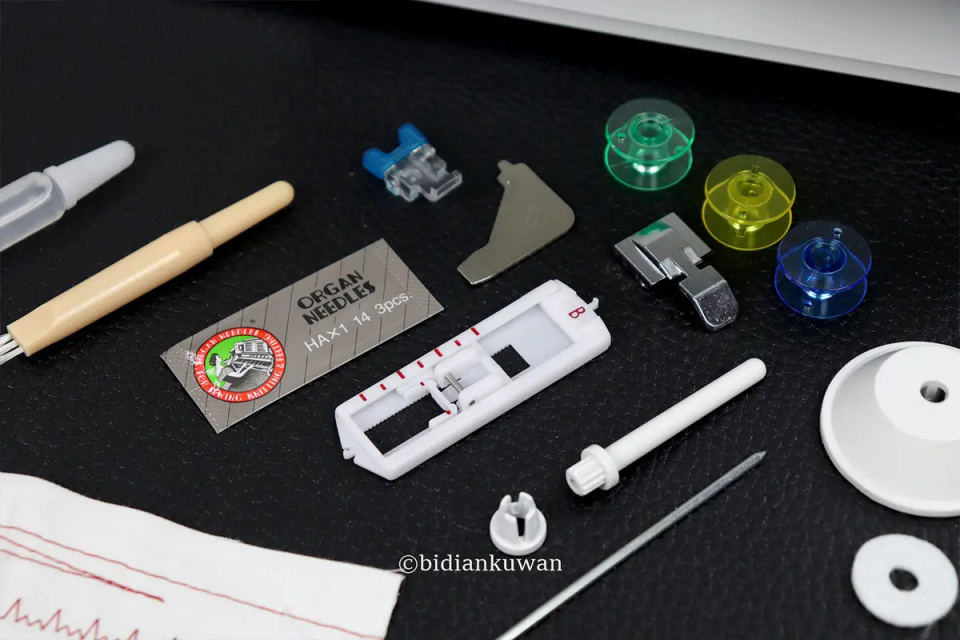 标配的附件,基本包括不同类型的针、机头部件、主机备用零件、线箍、清洁刷、润滑油等等。