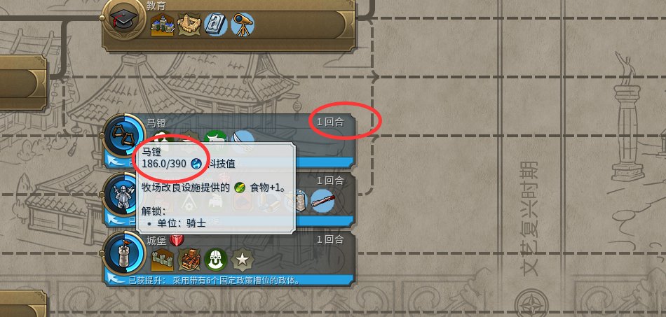 5.顯示科文進度(加強版)(Tech Civic Progress Plus) 能夠顯示科技和市政需要的準確數值,使科文進度變得更直觀了,無論大佬萌新有這個,都能減少很多計算強度。