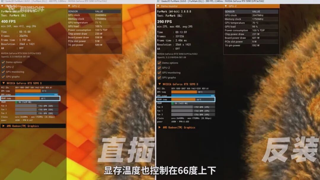 在直插與反裝兩種安裝方式的測試中,散熱表現基本一致:GPU核心溫度均爲70℃左右,顯存溫度控制在66℃上下,風扇轉速也較爲接近。使用測溫儀監測GPU背板溫度時,兩者也均維持在56℃左右,差異極小。