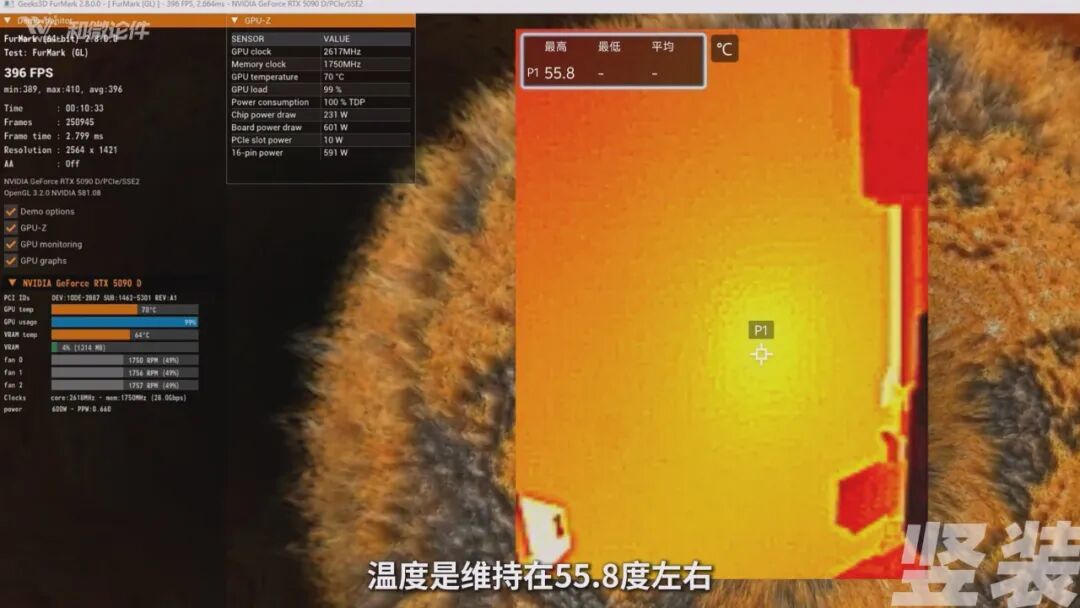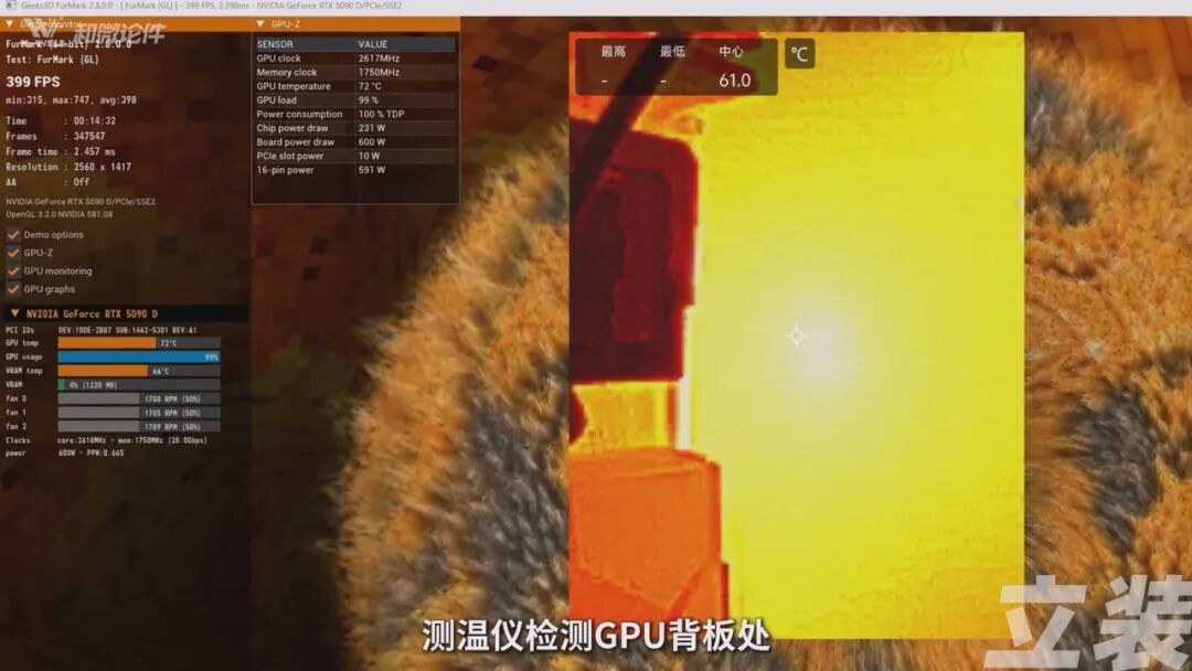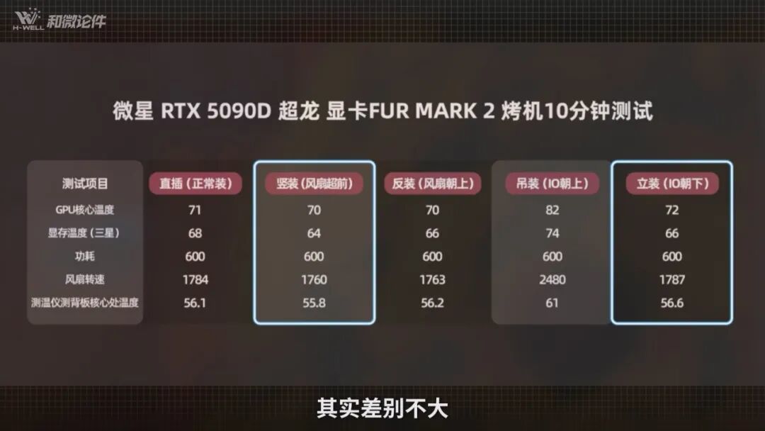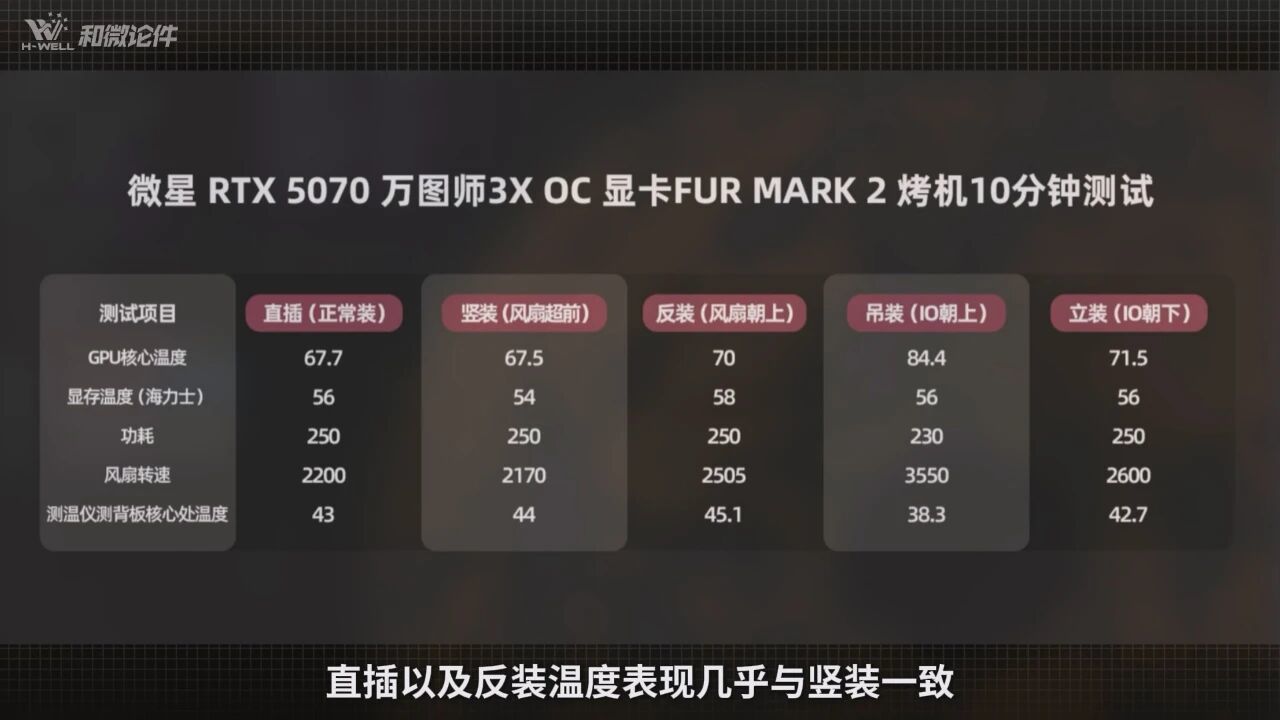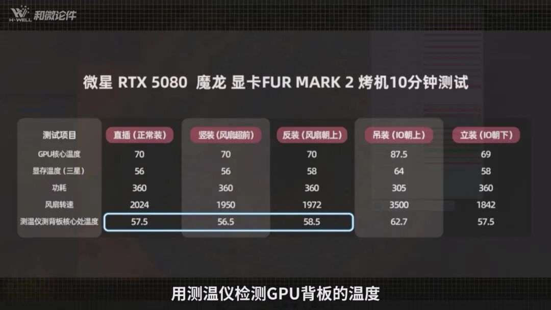 那麼在五種安裝方式中表現如何?實測在室溫25℃環境下,豎裝表現最佳:功耗穩定跑滿600W,GPU核心溫度僅70℃左右,三星顯存溫度控制在64℃,風扇轉速1760RPM,烤機時背板溫度約爲55.8℃,散熱效能非常出色。