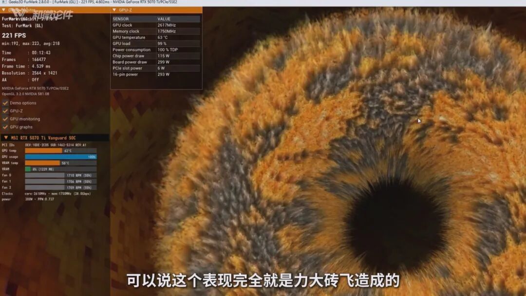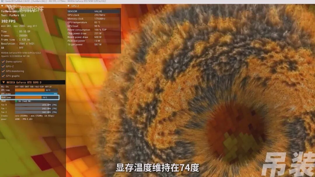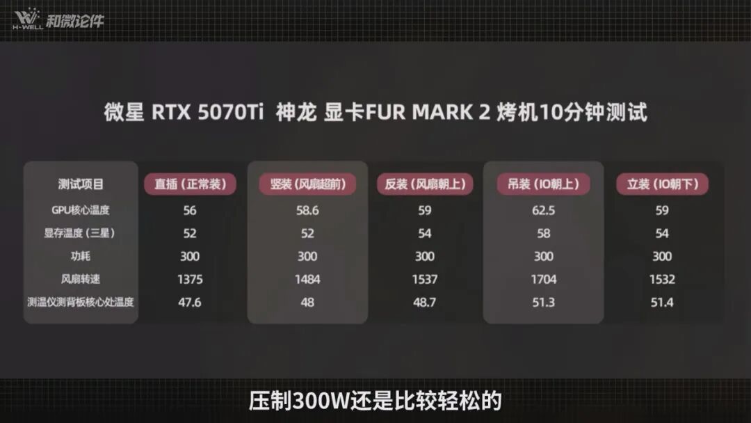 在吊裝測試中,5070Ti 神龍並未出現如5080魔龍般的降頻現象,功耗依然跑滿300W,GPU核心溫度控制在62.5℃,顯存溫度爲58℃,風扇轉速約爲1700 RPM,較其他安裝方式提高數百轉。這一表現可謂“力大磚飛”——其散熱模具直接繼承自5080神龍,壓制300W功耗較爲輕鬆,但仍能看出吊裝對散熱效率存在一定影響