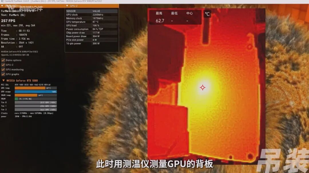 在吊裝測試中,5080魔龍的表現並不理想:顯卡出現降頻,功耗僅維持在305W左右,相比其他安裝方式降低了約55W。GPU核心溫度達到87.5℃,顯存溫度爲64℃,即使風扇轉速提升至3500 RPM,仍未能有效壓制溫度。此時GPU背板最高溫度達到了62.7℃,散熱效率明顯不足。
