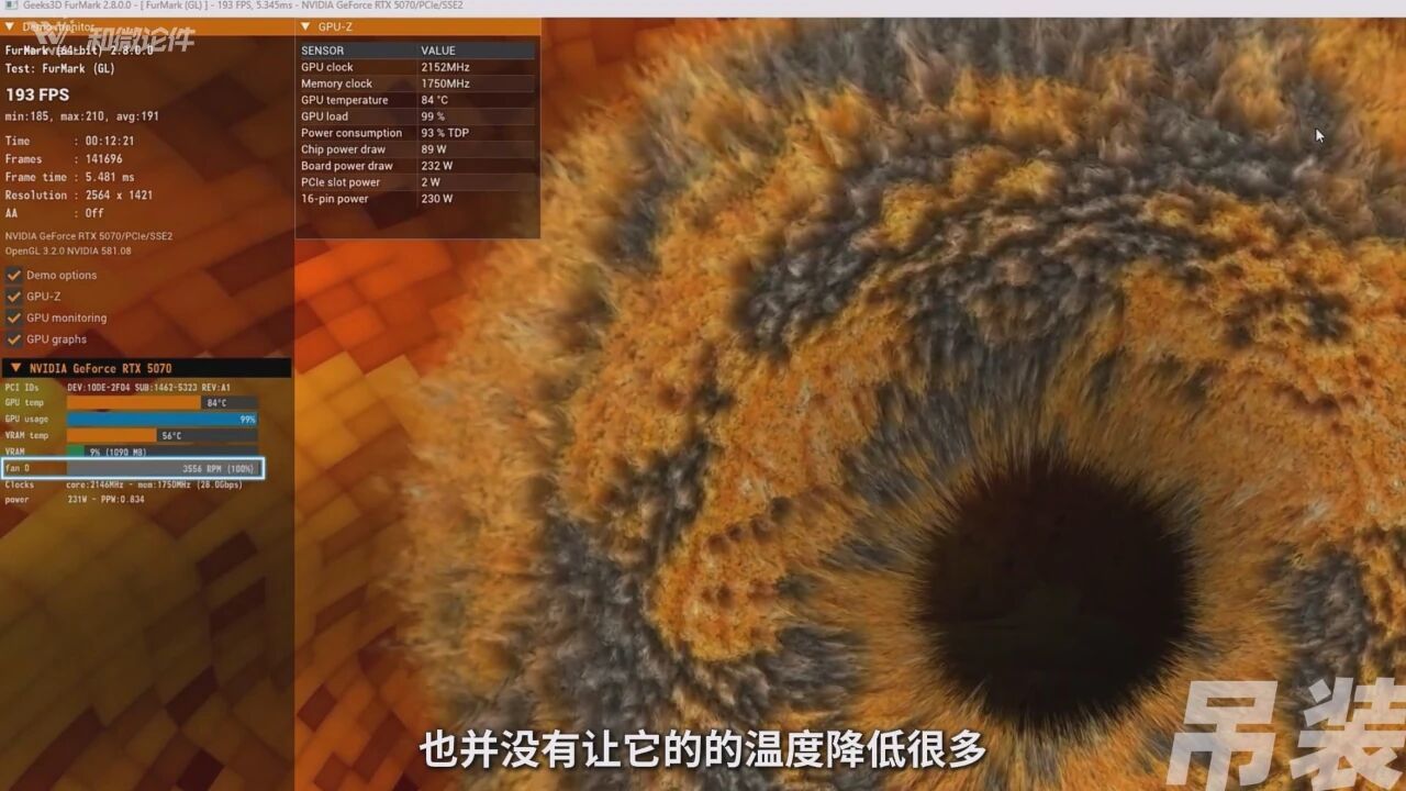 在吊裝測試中,這張5070萬圖師3X OC 出現了降頻現象,功耗無法穩定在250W,下降至230W左右,GPU核心溫度達到84.4℃。即便風扇轉速高達3550 RPM,仍未能有效壓制溫度,散熱表現受到明顯影響。