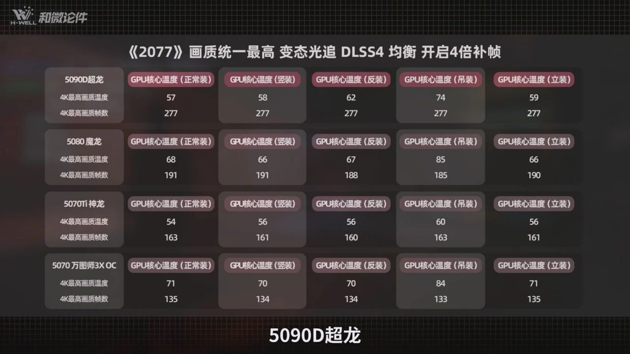最後我還針對這5種裝法分別進行了賽博朋克2077的遊戲實測,測試場景均選用的是4K分辨率下最高畫質同時打開變態級別光追以及4倍的幀生成。看看在遊戲過程中,不同的裝法會不會影響到溫度以及遊戲的幀數。