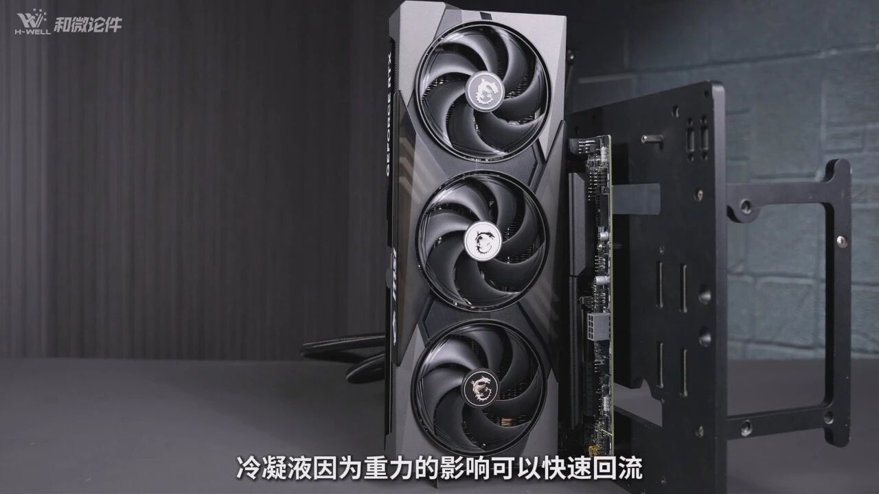 吊裝將顯卡倒掛,熱管蒸發端在上方,冷凝端在下方,冷凝液需向上滲透迴流,蒸汽也要向下蒸發,完全違背自然規律,雙重DEBUFF加持,溫度表現自然不太行了。