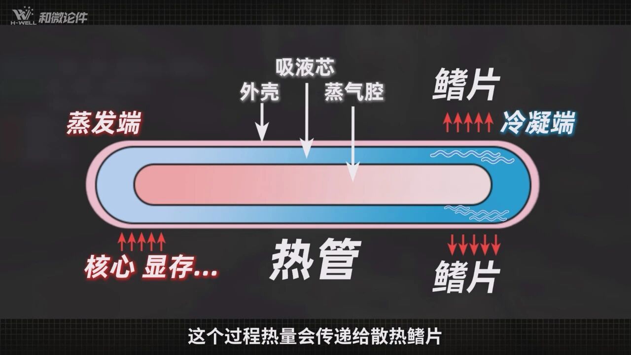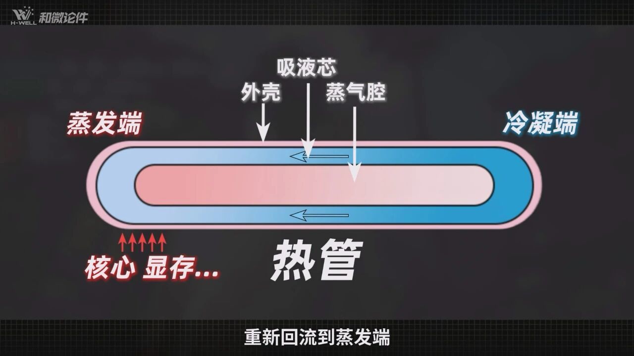 因爲顯卡工作時,熱量會通過銅底、均熱板或熱管聚集到熱管蒸發端。熱管內部爲真空環境,含有少量冷凝液,受熱後液體迅速汽化爲蒸汽,蒸發端壓力升高,蒸汽在壓差作用下快速流向溫度較低的冷凝端。在冷凝端,蒸汽因降溫而重新凝結爲液體,同時將熱量傳遞給散熱鰭片,最終由風扇排出。凝結後的液體藉助熱管內部毛細作用重力輔助迴流至蒸發端,由此形成一個高效持續的熱循環系統