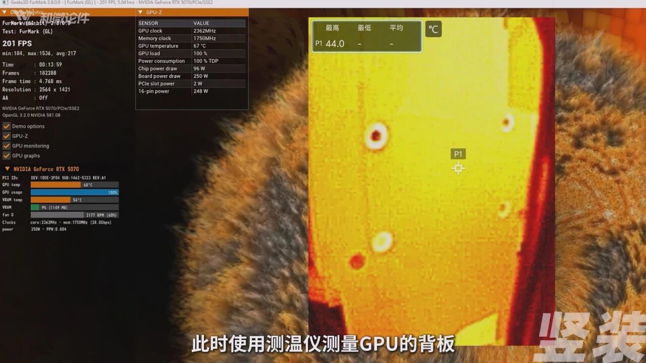 在測試中,豎裝表現最佳:顯卡功耗滿血運行至250W,GPU核心溫度控制在67.5℃,搭載的海力士GDDR7顯存溫度僅54℃,風扇轉速約爲2170 RPM,GPU背板溫度爲44℃,整體散熱效能非常出色。