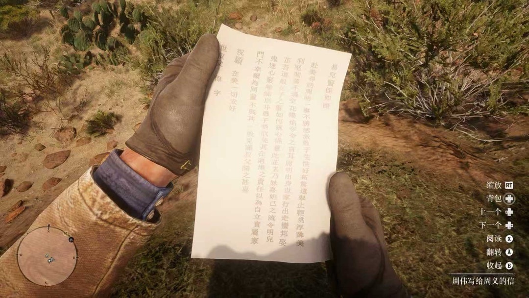 靠近后地图上有个X,靠近后先拾取瓜皮帽,然后再搜刮出这封全游戏唯一的中文信。